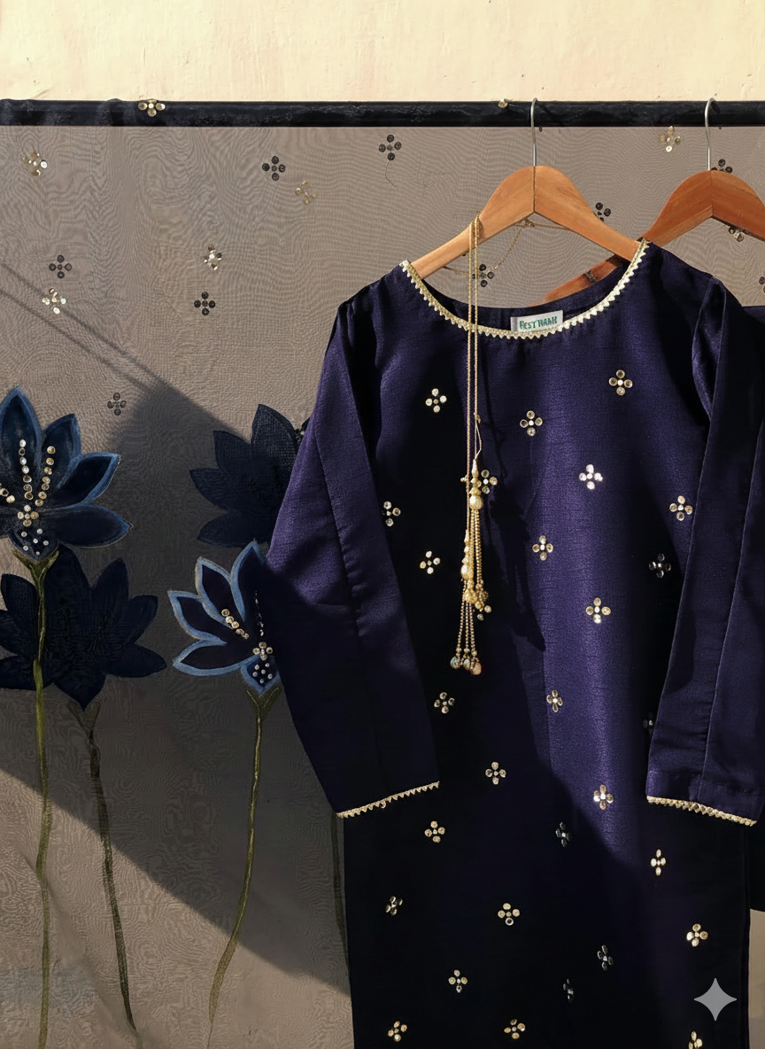 DESIGN CODE: BLUE_5KPackage Includes:1PC SHIRT1PC TROUSER1PC DUPATTA.FABRIC DETAILS:This eid dress fabric features a pale purple...