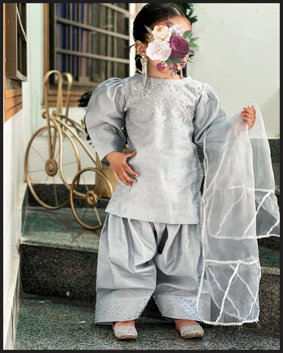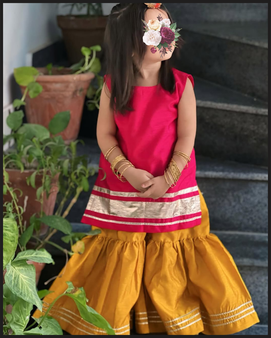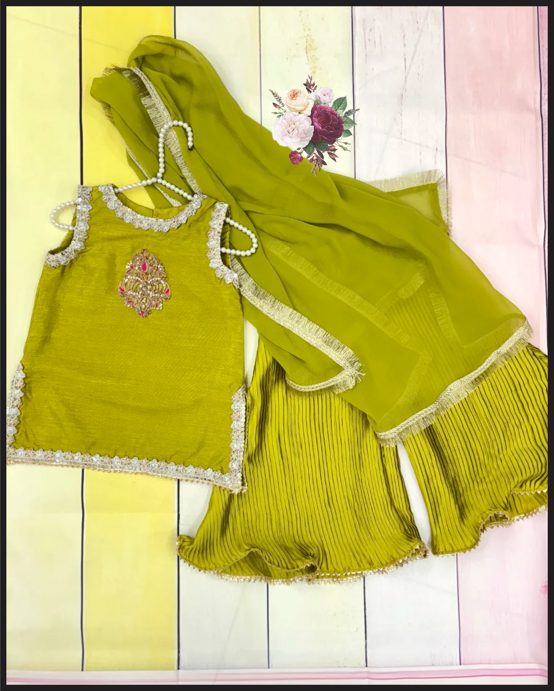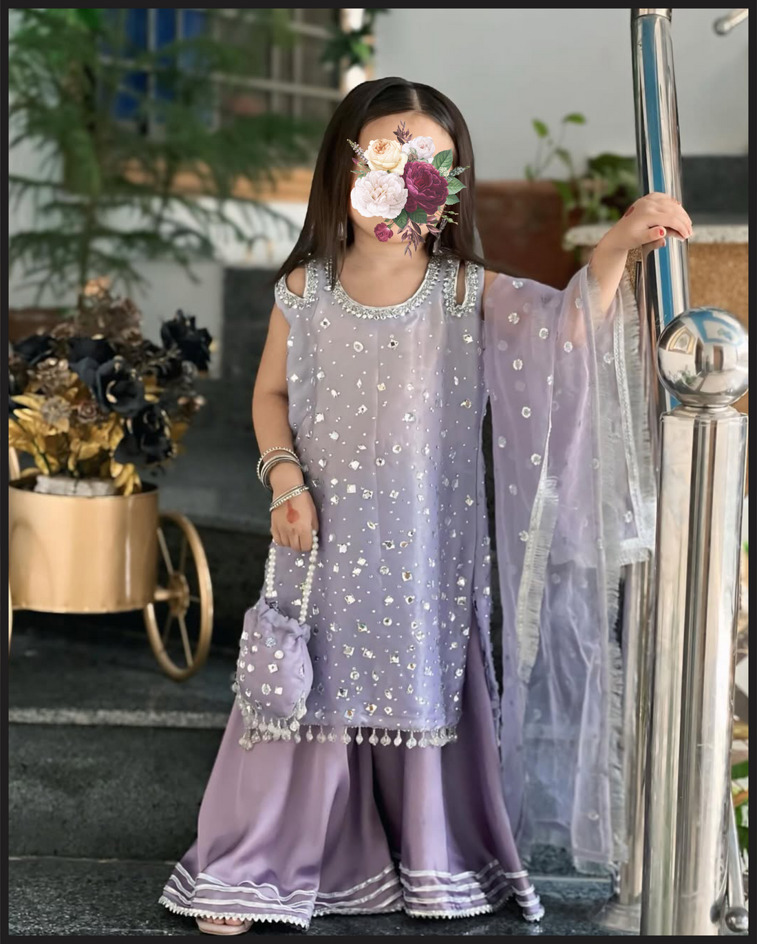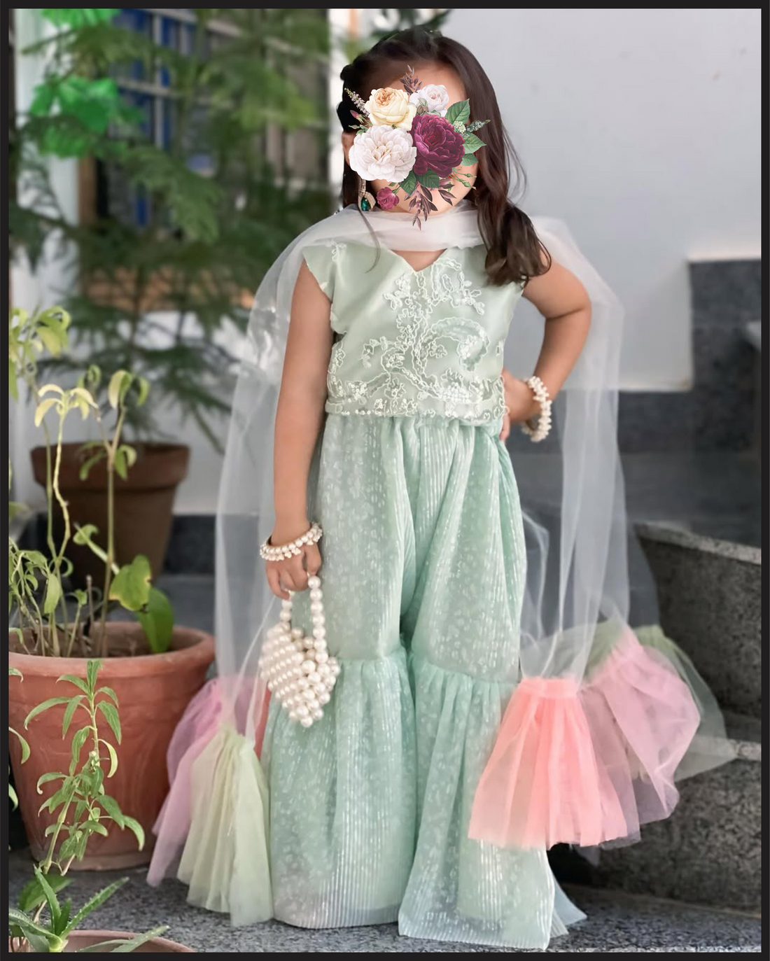 FABRIC DETAILS: This baby dress features exquisite handmade adda work paired with a traditional sharara...