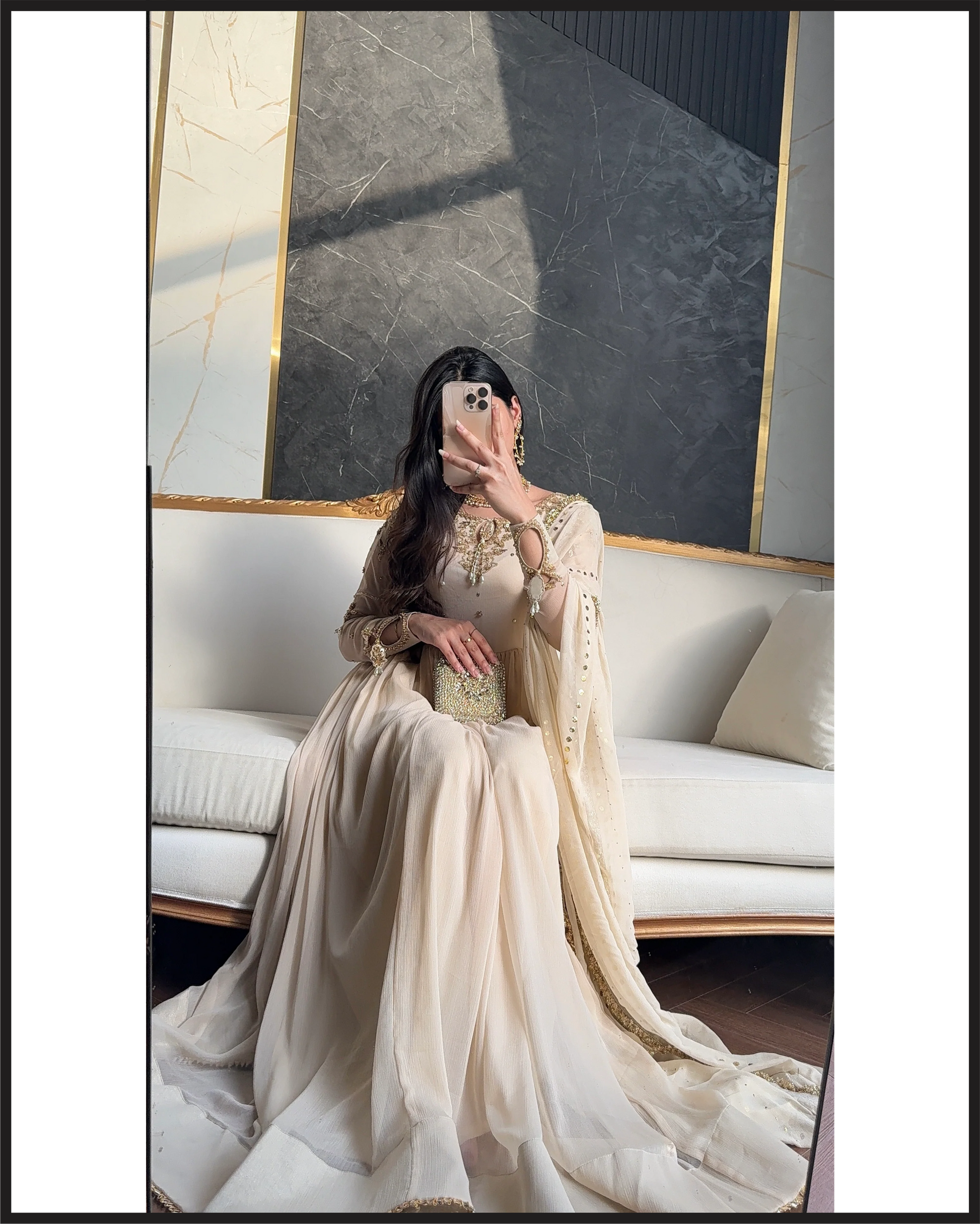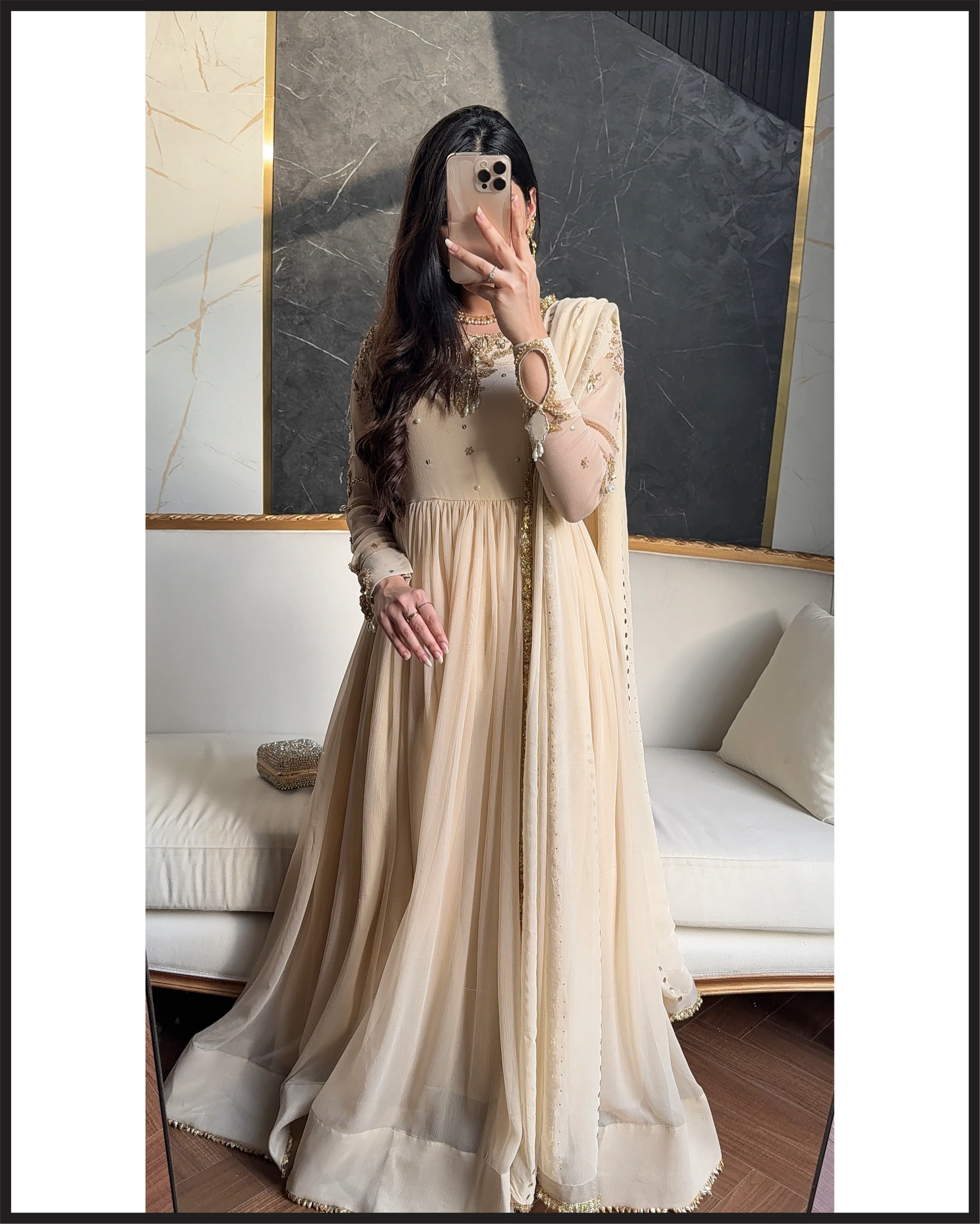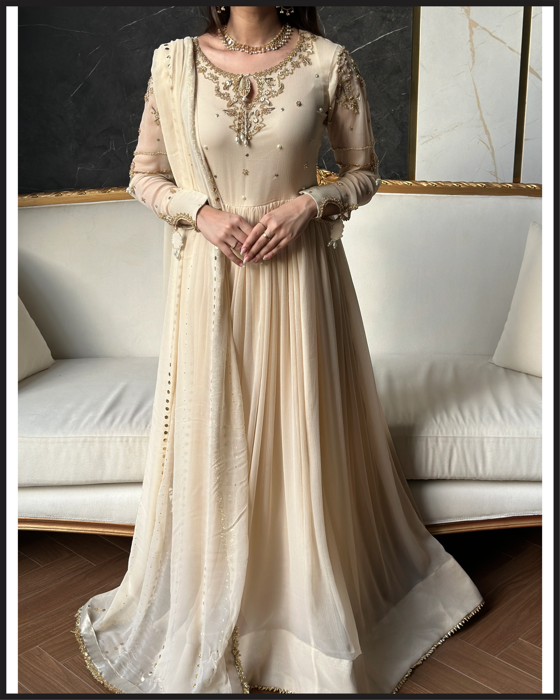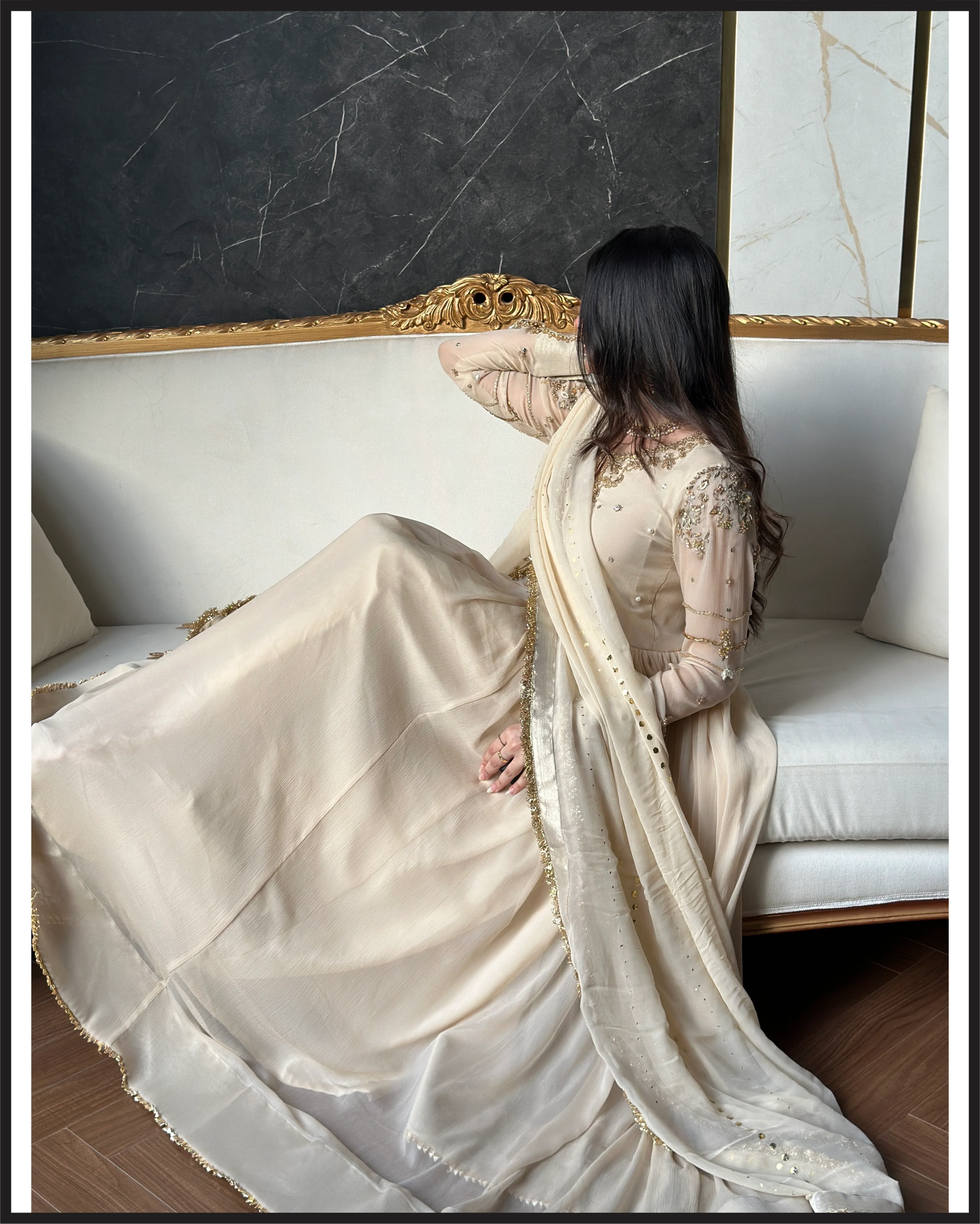 This exquisite chiffon kalidar peshwaas is a canvas of intricate hand-embroidered artistry, adorned with delicate aroha, kutdana, moti, and dabka work. The elegant tassels and pearls on the sleeves add a touch of grace, while the trouser complements the refined silhouette. Paired with a chiffon dupatta, beautifully finished with lace and tassels spray of gotta sitara, this ensemble is the perfect blend of tradition and luxury.