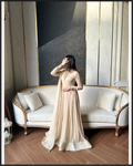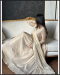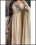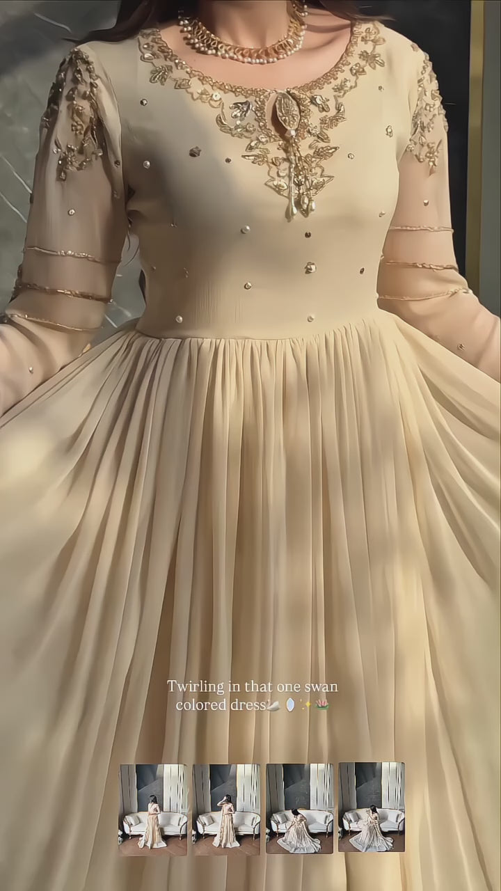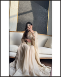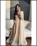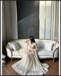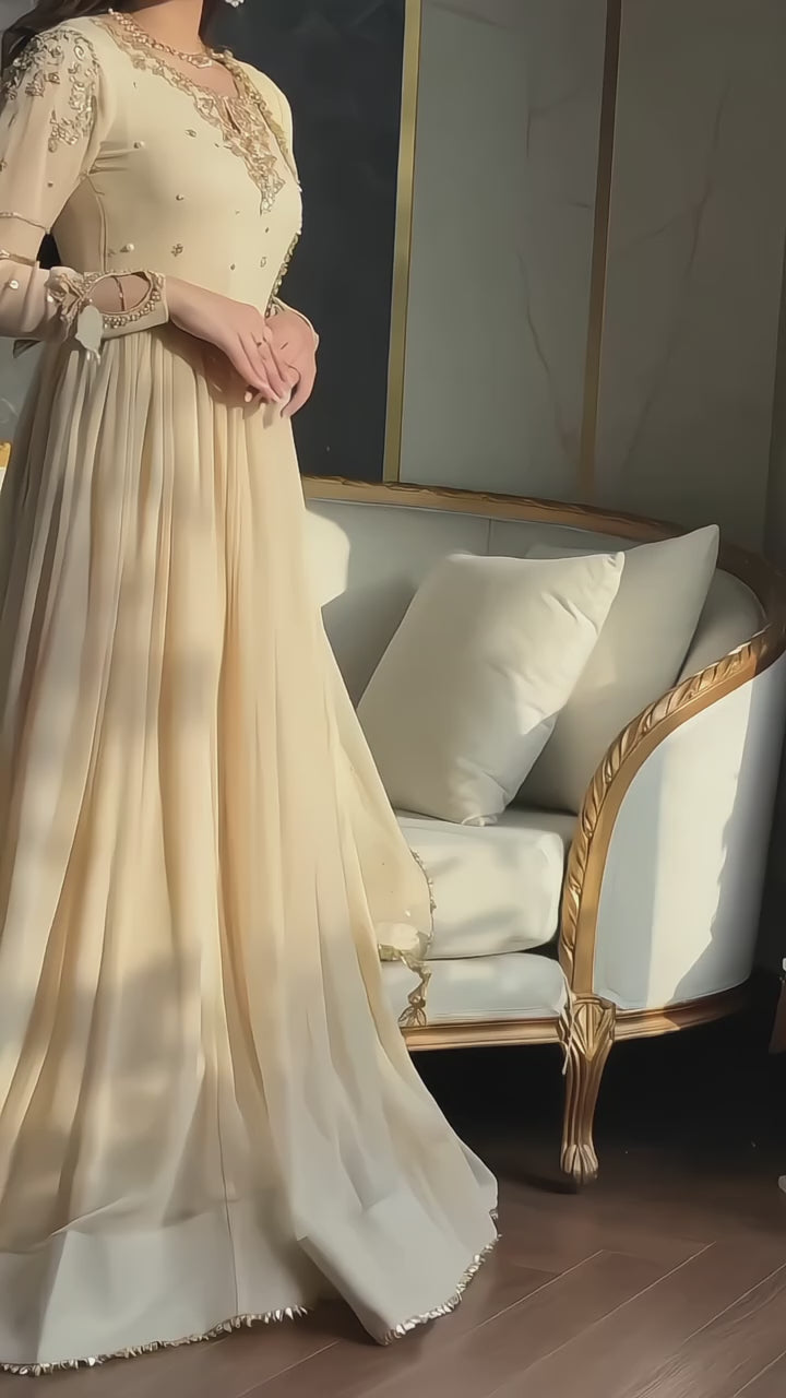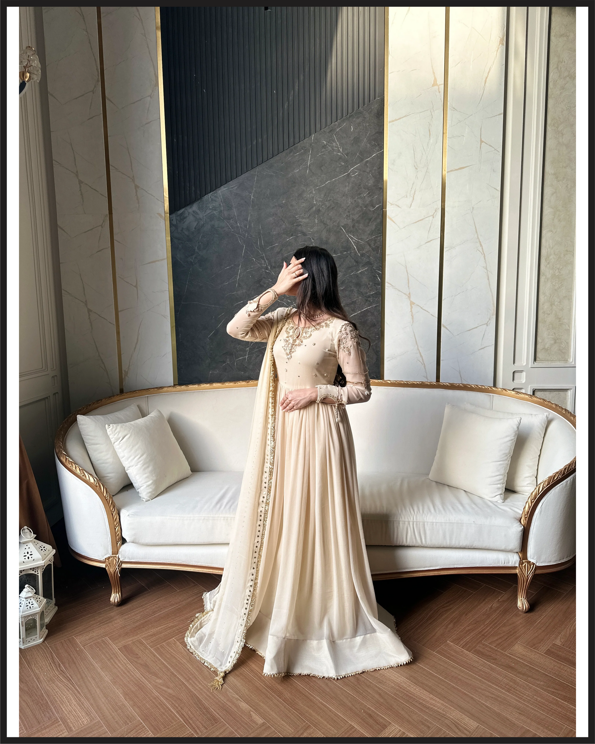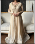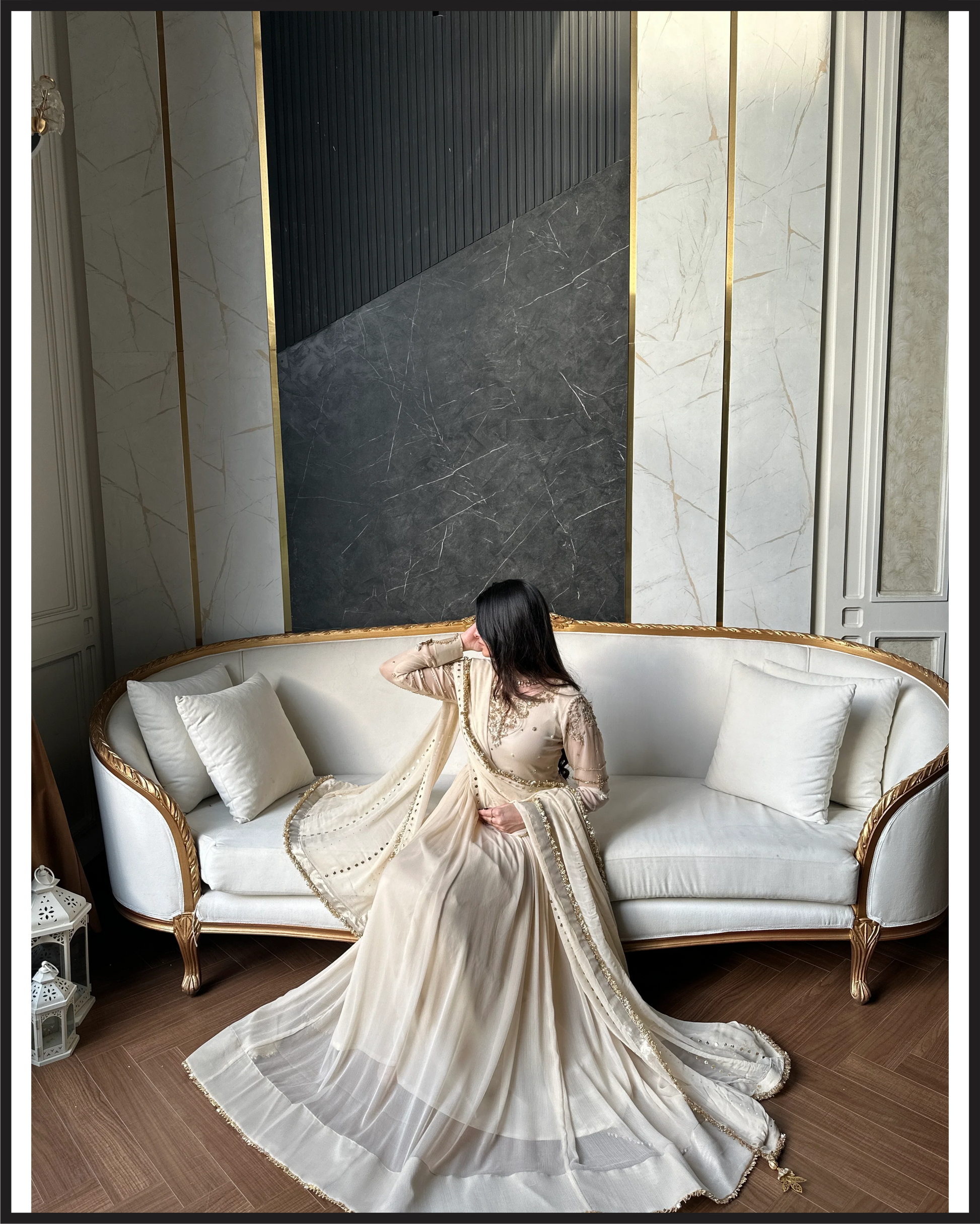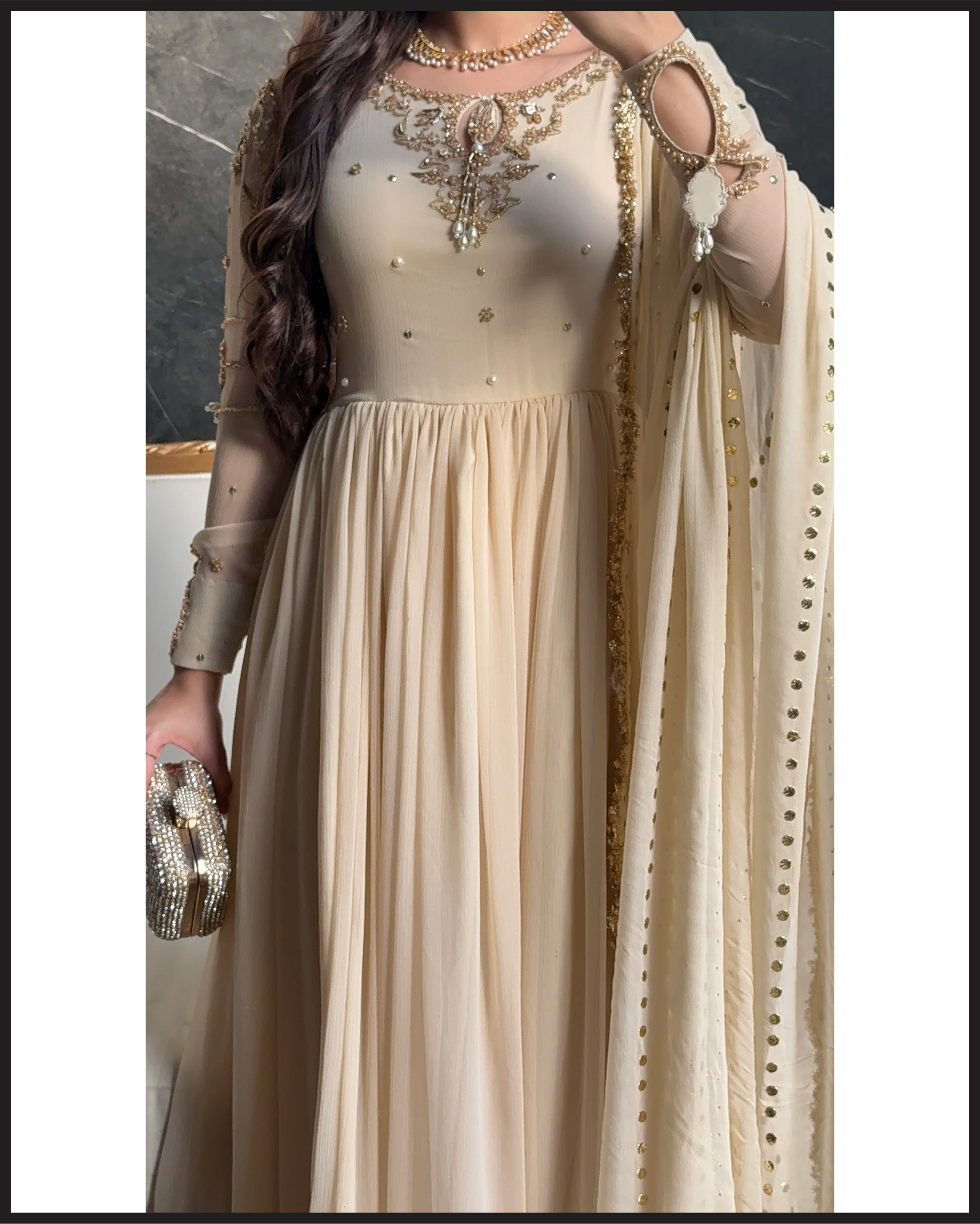 This exquisite chiffon kalidar peshwaas is a canvas of intricate hand-embroidered artistry, adorned with delicate aroha, kutdana, moti, and dabka work. The elegant tassels and pearls on the sleeves add a touch of grace, while the trouser complements the refined silhouette. Paired with a chiffon dupatta, beautifully finished with lace and tassels spray of gotta sitara, this ensemble is the perfect blend of tradition and luxury.
