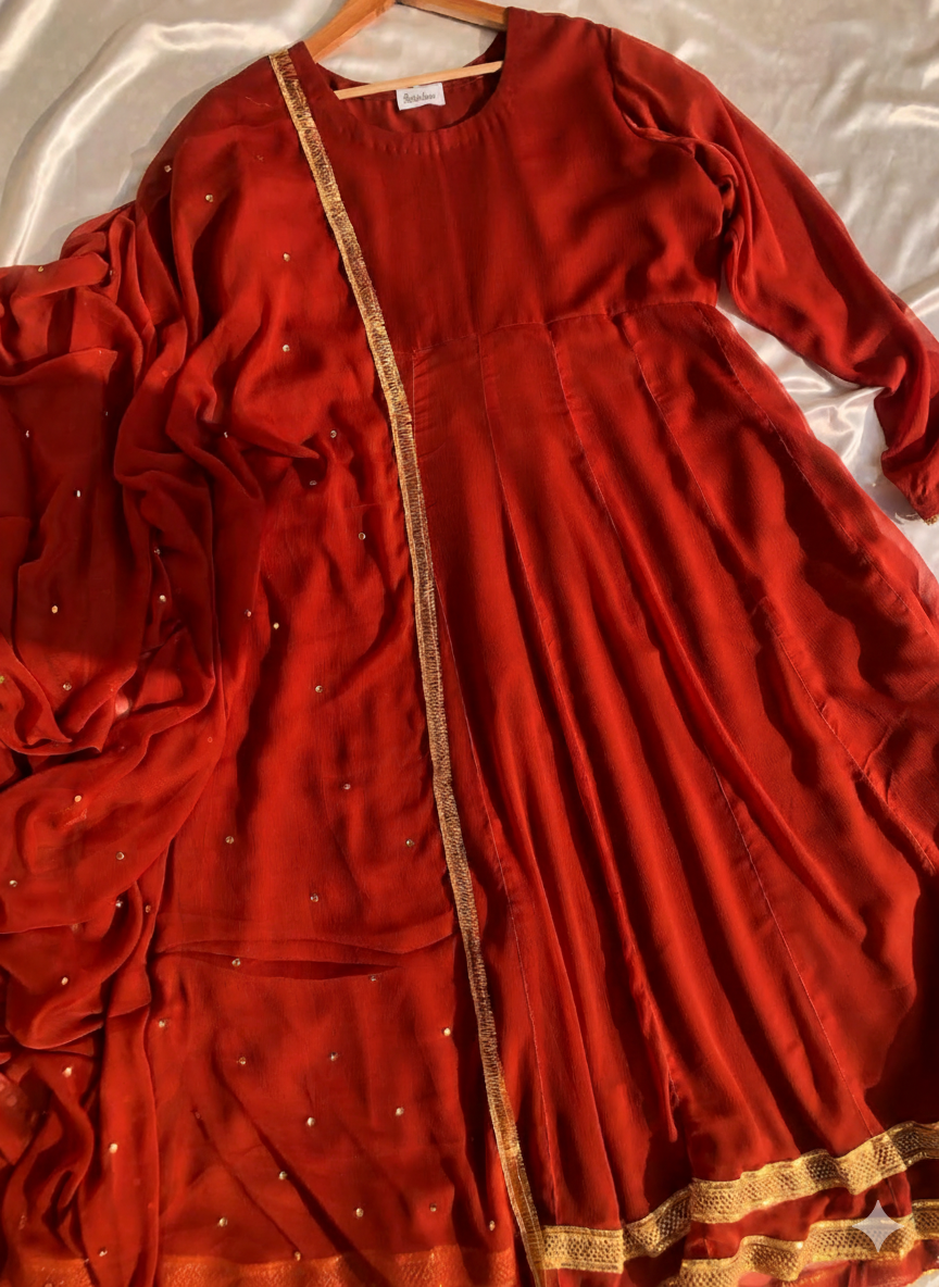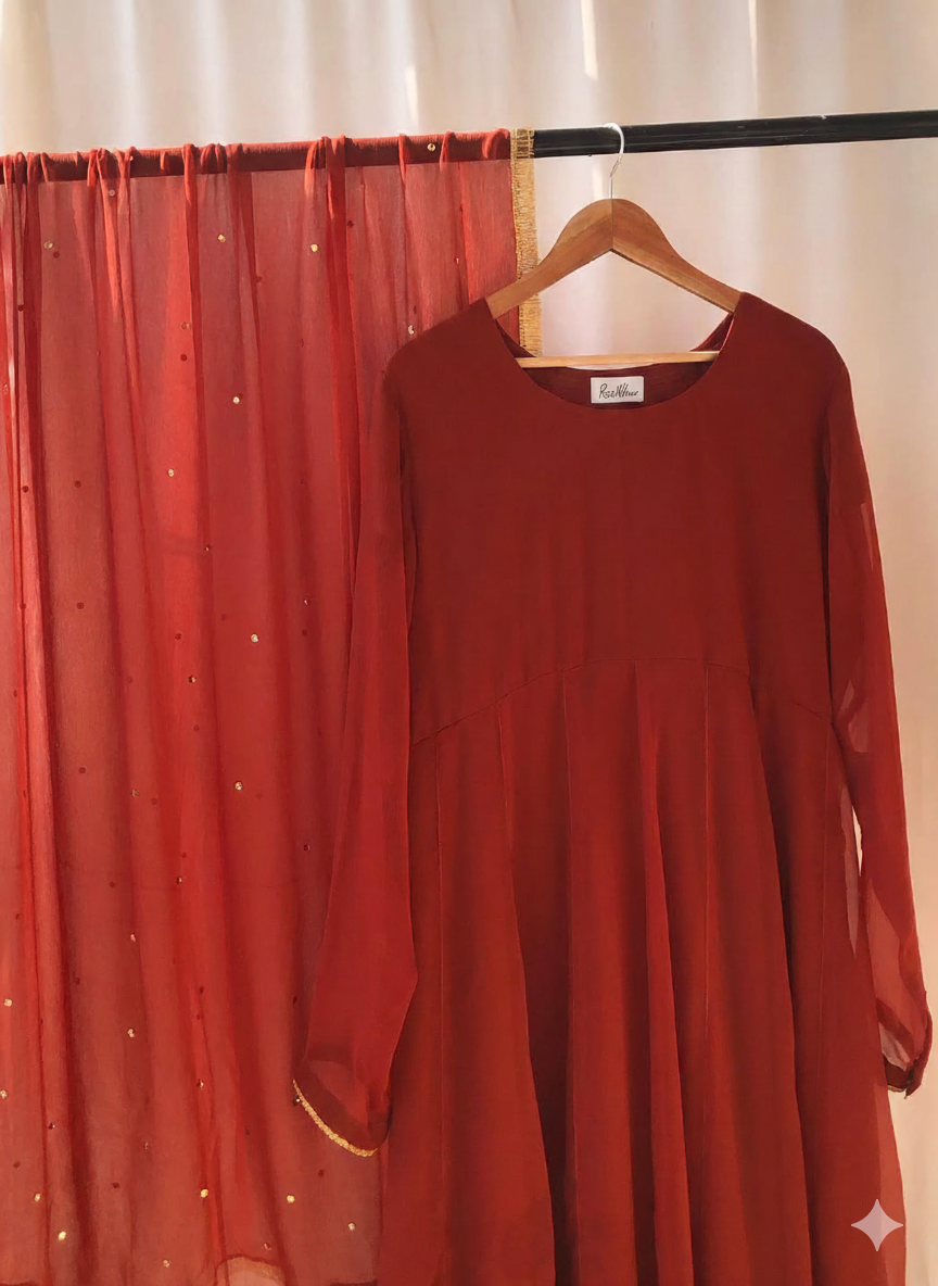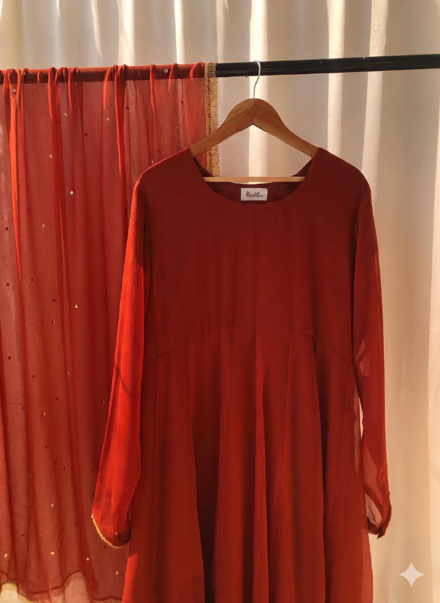 This eid dress fabric features carrot hue crafted from pure chermouse, ensuring softness and breathability. The handmade adda work adds intricate detailing, enhancing the aesthetic appeal while maintaining durability. Ideal for festive occasions, its quality construction promotes longevity, making it a valuable addition to formal attire.