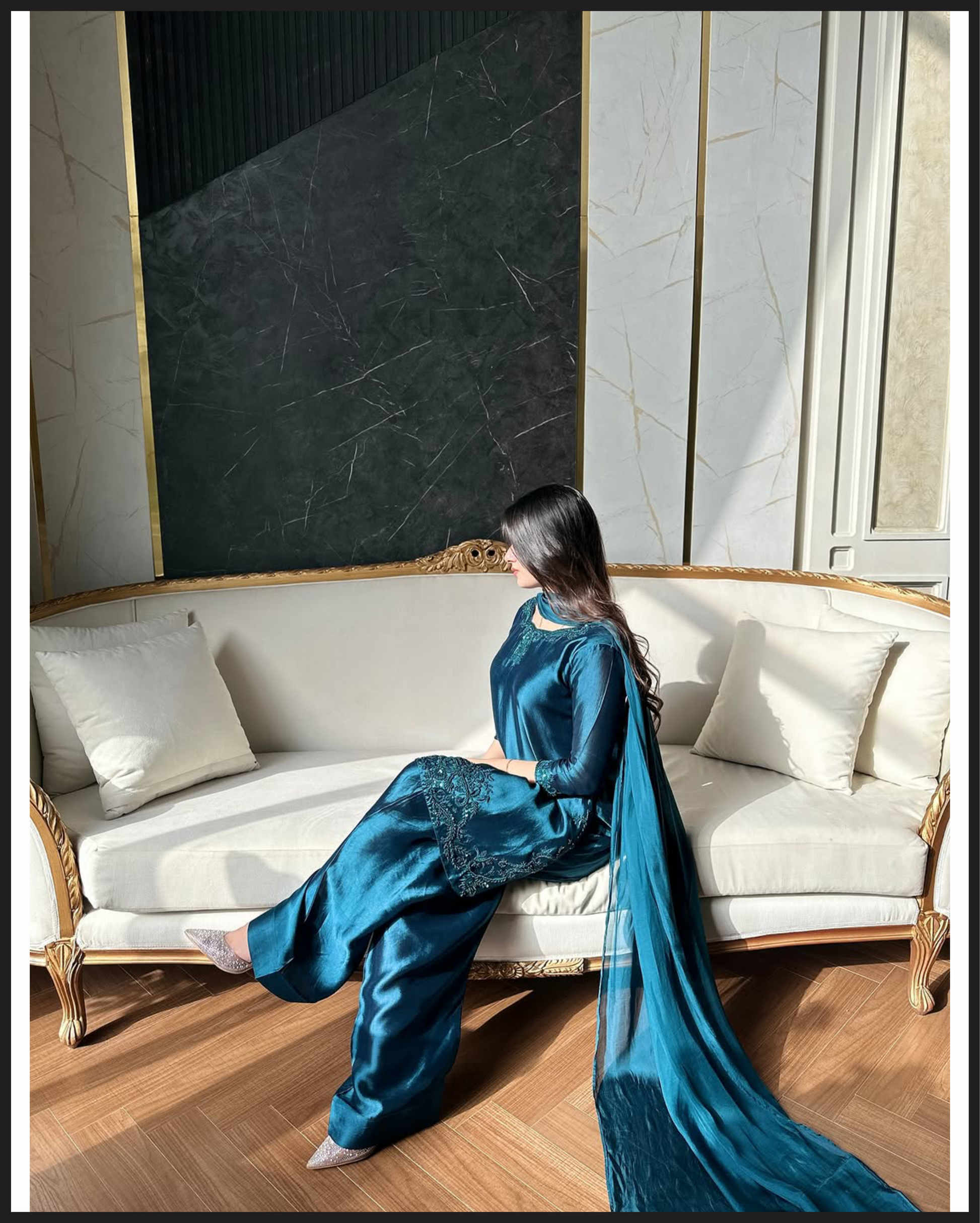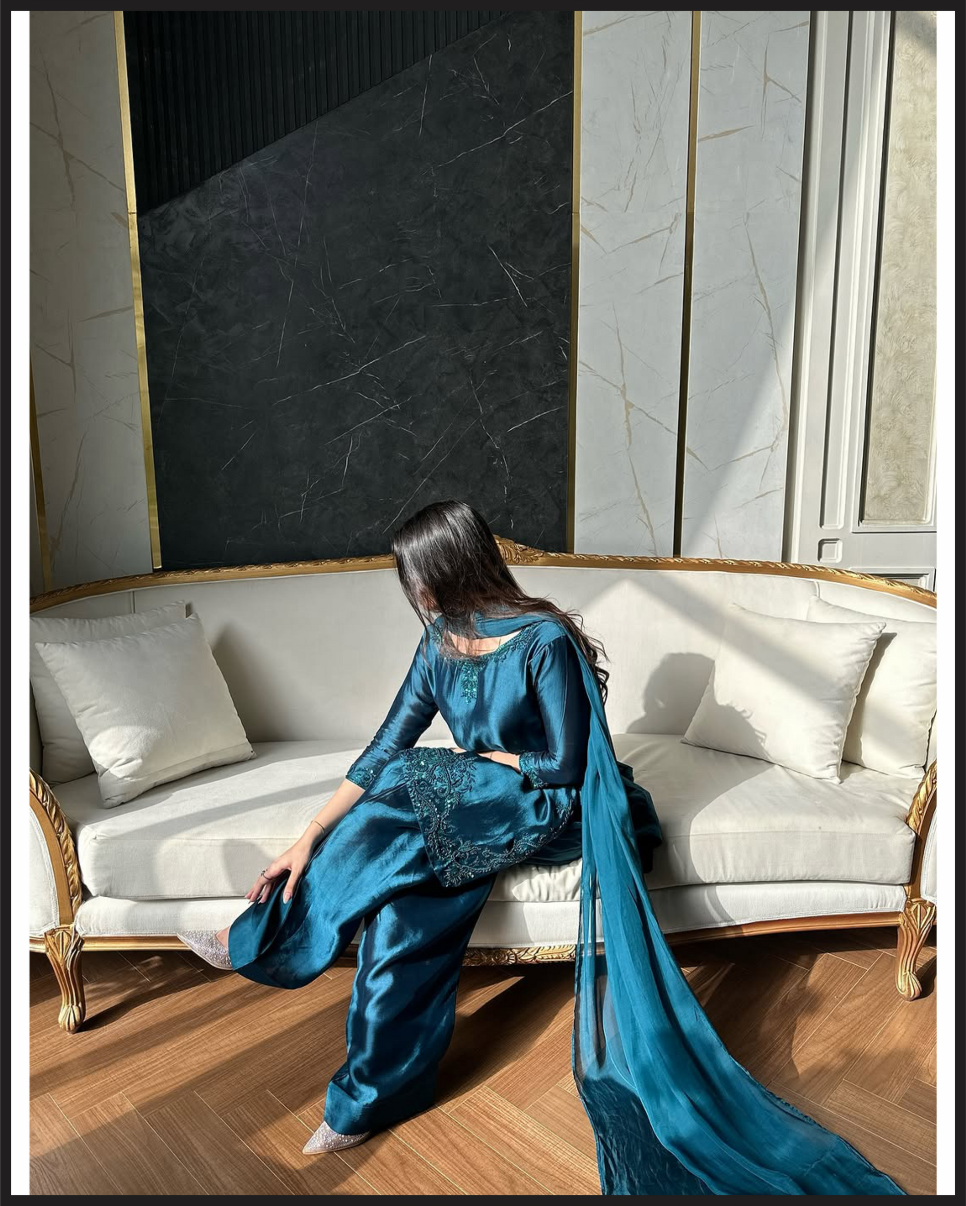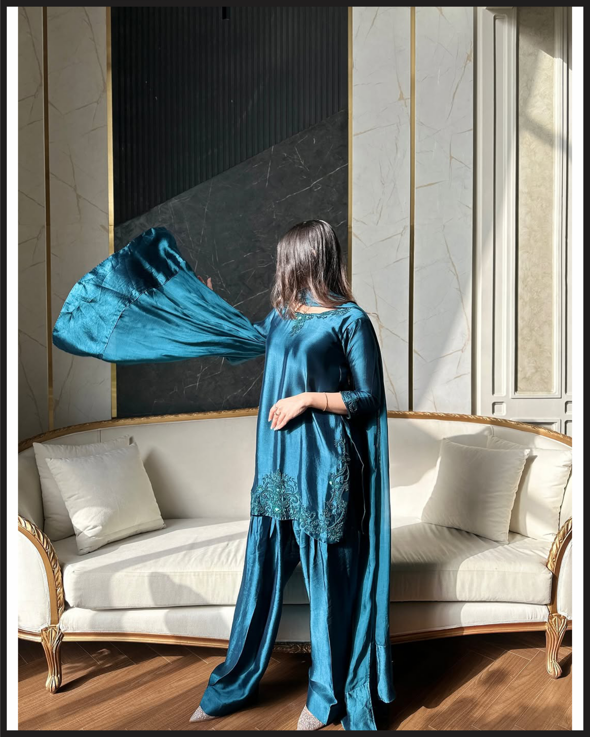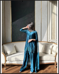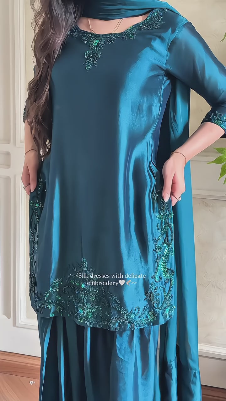 The Mehru dress features exquisite embroidery work on a short shirt, paired with a traditional farshi shalwar for a stylish and comfortable fit. This ensemble blends detailed craftsmanship with a flattering silhouette, making it a perfect choice for elegant occasions.