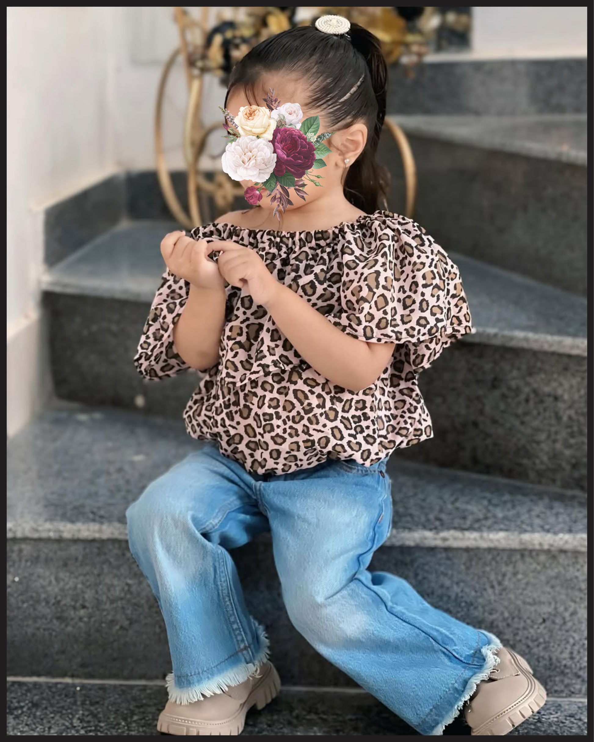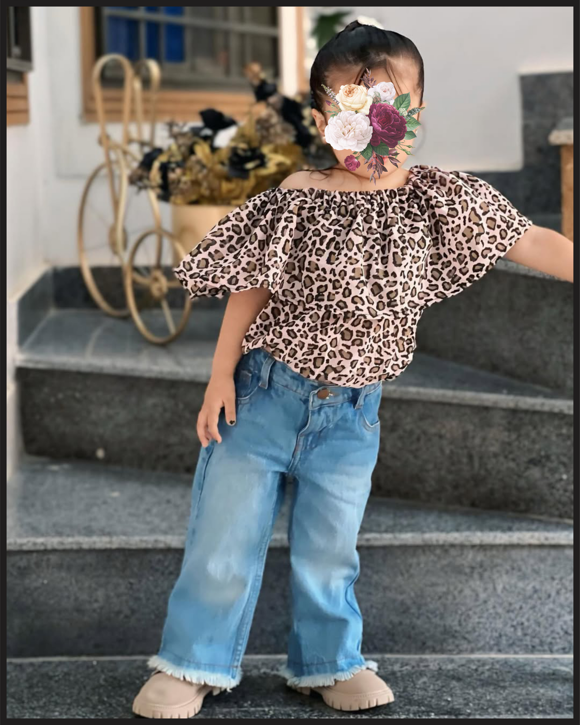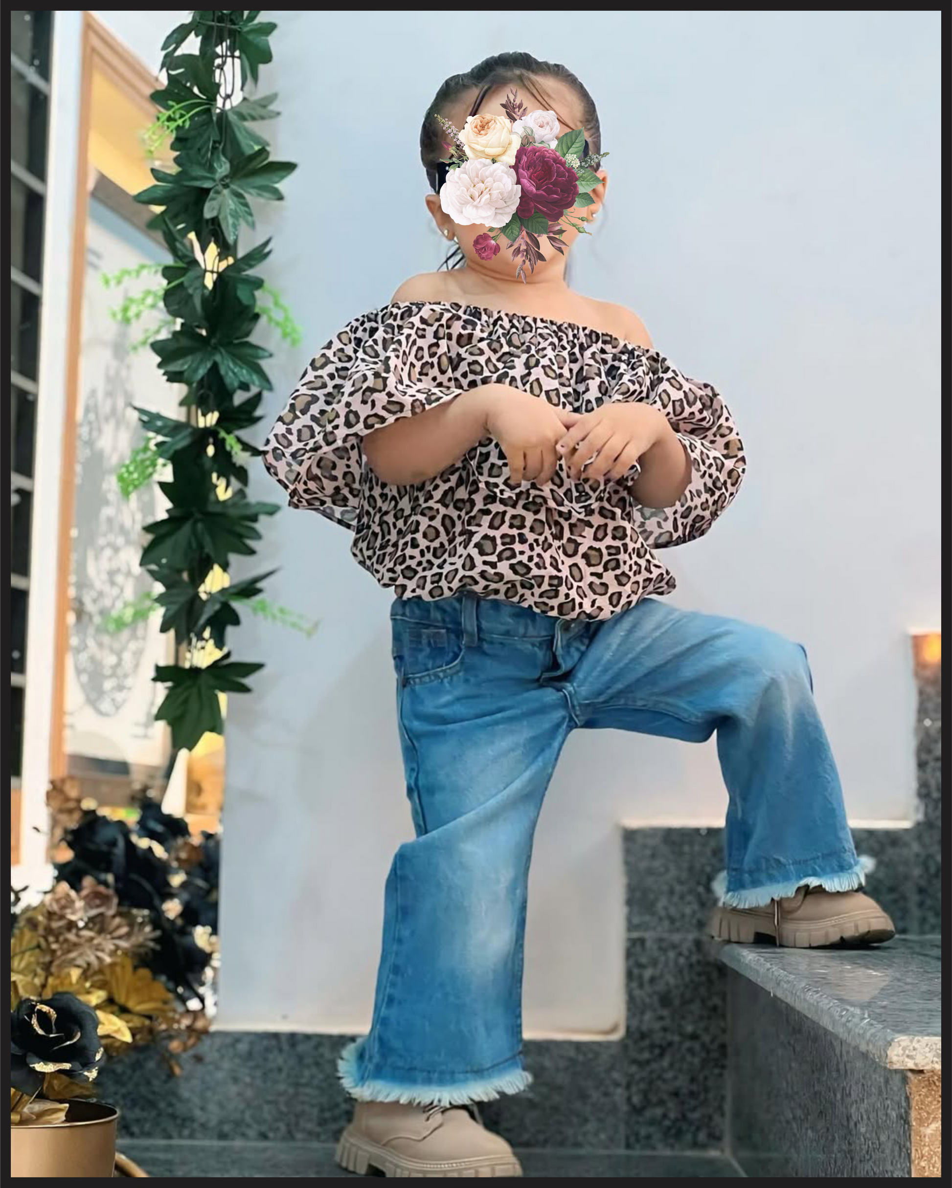 This baby getup combines a stylish cheetah print fabric top with comfortable jeans, creating a trendy yet practical outfit. The soft materials ensure ease of movement and comfort for your child, while the bold pattern adds a fashionable edge suitable for casual outings or playdates. Expertly designed to balance style and functionality.