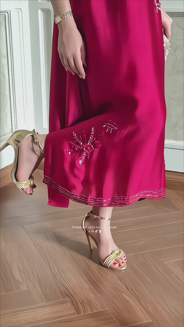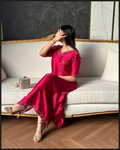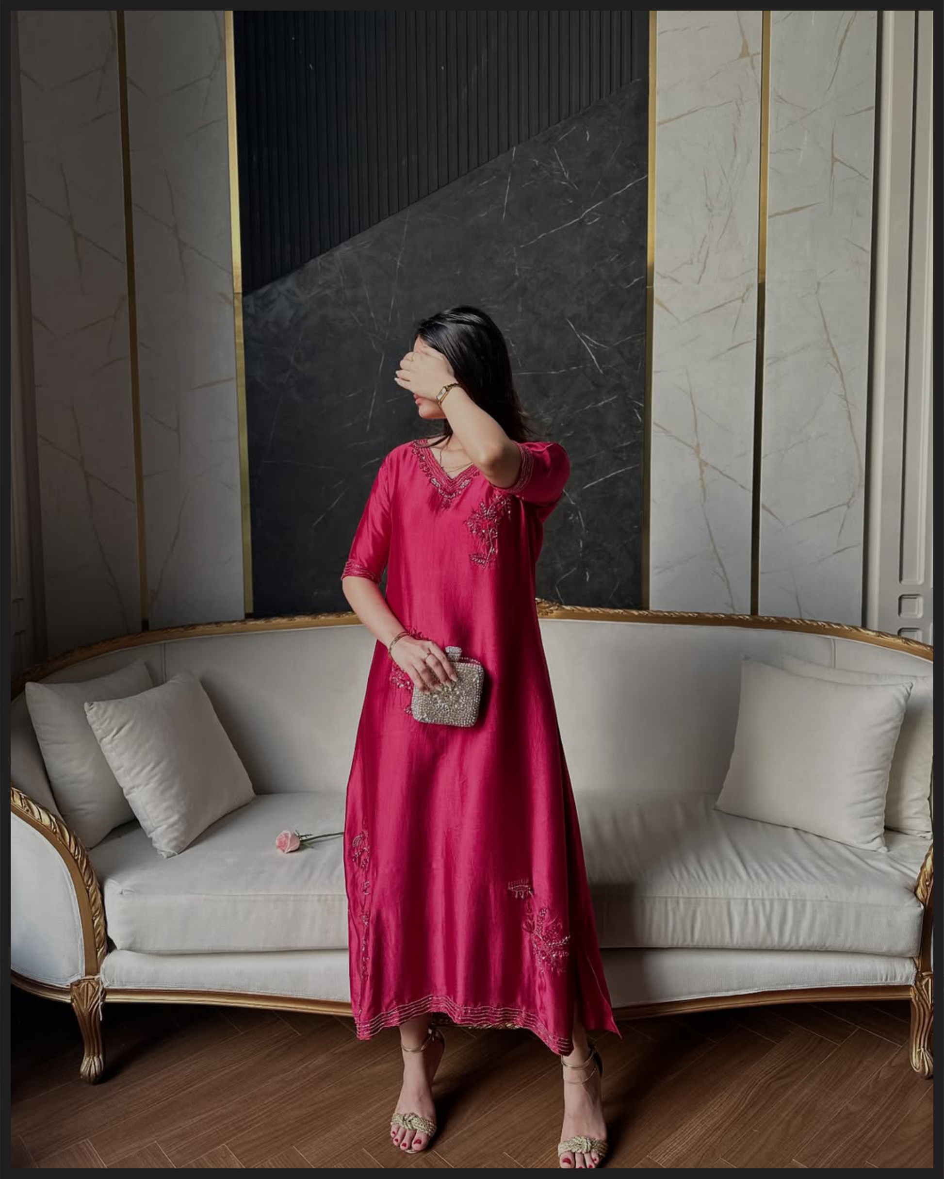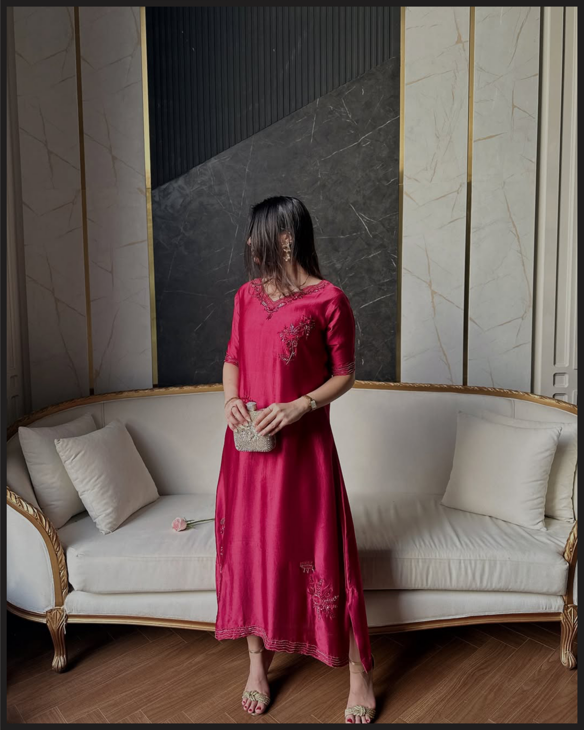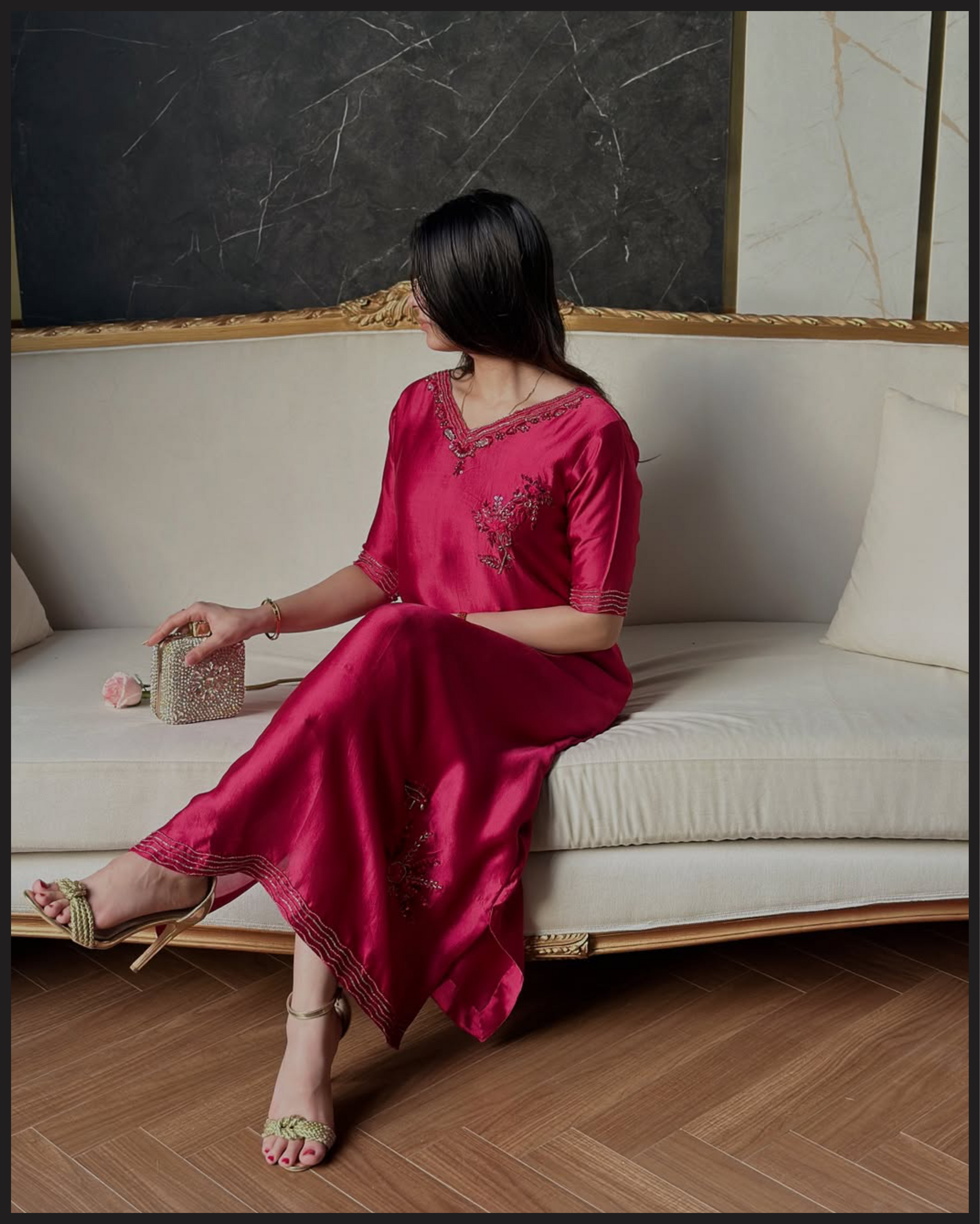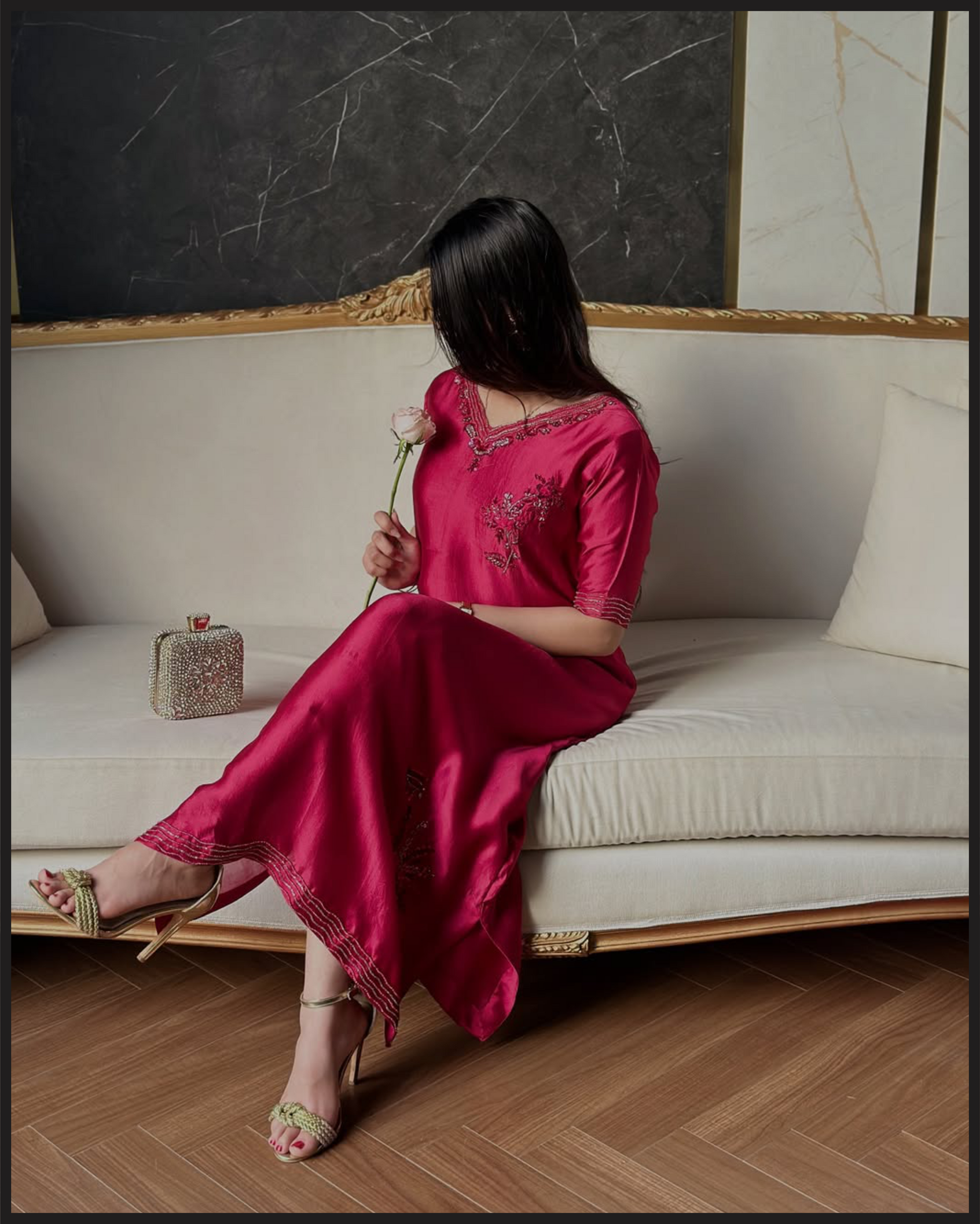 The Sakura dress highlights exquisite handmade adda work paired with a traditional Sharara. This thoughtfully crafted ensemble combines intricate detailing with a timeless silhouette, offering a refined and elegant look suitable for festive and formal occasions.
