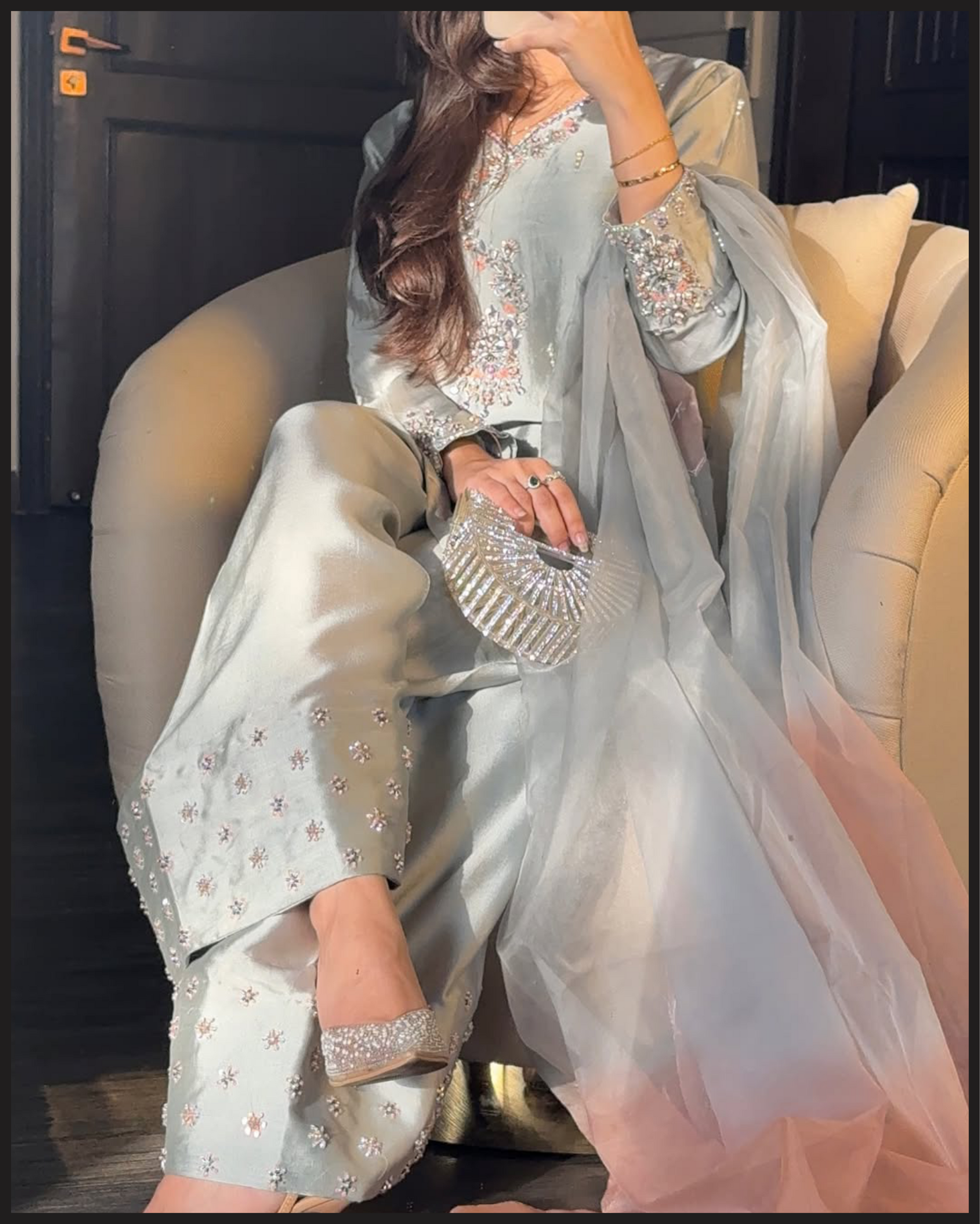 Experience exquisite craftsmanship with our handmade farshi shalwar, featuring highly intricate adda work. Complete the look with a beautifully handpainted dupatta. Elevate your style with this unique and elegant addition to your wardrobe.