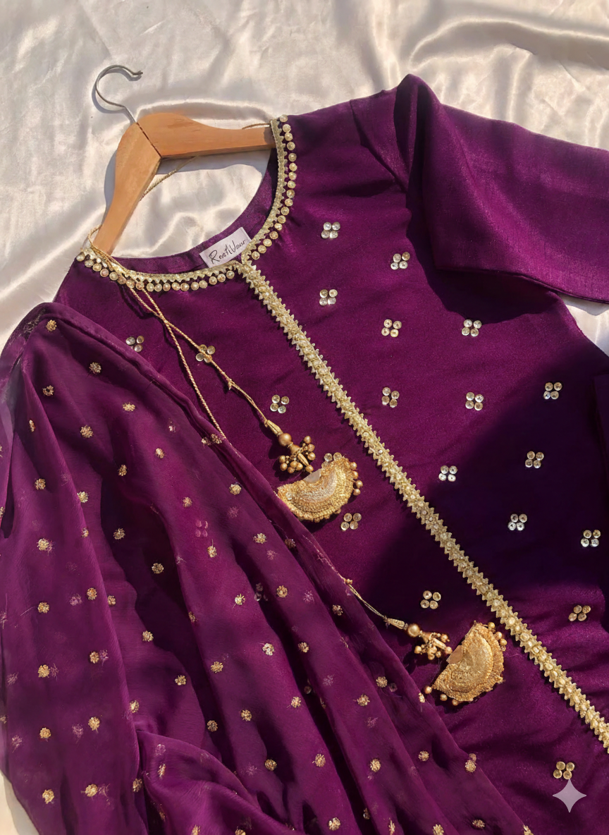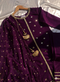 This eid dress fabric features a wine hue crafted from pure chermouse, ensuring softness and breathability. The handmade adda work adds intricate detailing, enhancing the aesthetic appeal while maintaining durability. Ideal for festive occasions, its quality construction promotes longevity, making it a valuable addition to formal attire.